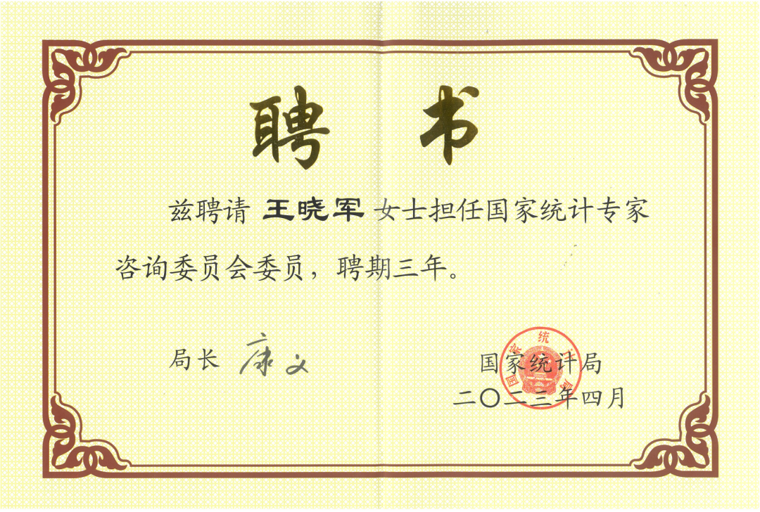 国家统计局党组书记、局长康义向王晓军教授等新一届国家统计专家咨询委员会委员颁发聘书,并强调要充分发挥国家统计专家咨询委员会的作用,为深入推进统计现代化事业提供重要智力支持。