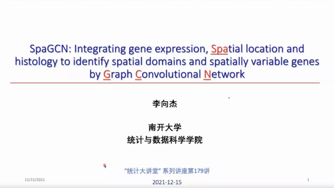 12月15日下午,“统计大讲堂”系列讲座第179讲举行。本次讲座采取线上会议的方式,邀请南开大学统计与数据科学公司讲师李向杰作题为“利用图卷积网络整合分析空间转录组数据、空间位置和组织学图像数据”的报告。讲座由英国威廉集团官网教授张景肖主持。