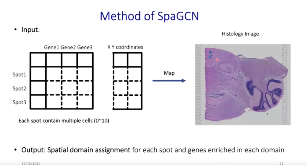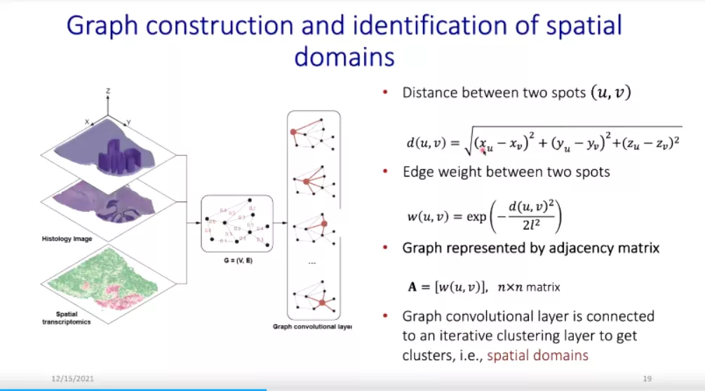 接下来,他介绍了图卷积神经网络。在处理组织信息时,邻接矩阵的构造需要空间转录组、组织学图像、各点物理位置的信息,然后聚类得到空间域。紧接着他进一步对SpaGCN方法的原理进行了说明。