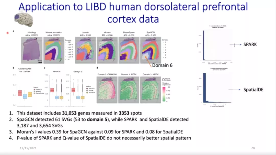 他给出一些数据集作为例子,对采用不同方法得到的结果进行比较,从而证明SpaGCN方法的优越性。第一个是关于乳腺癌的数据集,在小样本量的情况下通过SpaGCN方法得到了比较好的数据结果。第二个是LIBD人脑数据集,含有较多的切片数据。用Louvain、stLearn、BayesSpace、SpaGCN四种方法分别进行聚类得到图像后,SpaGCN在ARI、SVGs、Morgan’s I values的数值上均优于stLeam、BayesSpace方法。对于P值较小的基因,Spark和SpatialDE虽然能够探测更多SVGs,但与SpaGCN相比,二者在图像上不能与空间域进行较好的对应,数据代表性更低。第三个是小鼠后脑切片的数据集,在这一例子中对相似或相连的切片构造了新的邻接矩阵。第四个数据集是STARmap,在没有可用的图片数据时,引入HMRF和四种方法进行比较。第四个是关于小鼠嗅球的数据集,Spark和SpatialDE对SGVs的分析结果难以辨识,而利用SpaGCN方法呈现的结果更好。第五个数据集关于小鼠大脑,数据分布密集。最后的MERFISH数据集,测得基因数较少,细胞数较多。从不同的方法对六个数据集的分析结果中可以看出,SpaGCN在聚类上比stLearn、BayesSpace表现更好,且选取的SVGs比SpatialDE、SPARK方法更具有代表性。