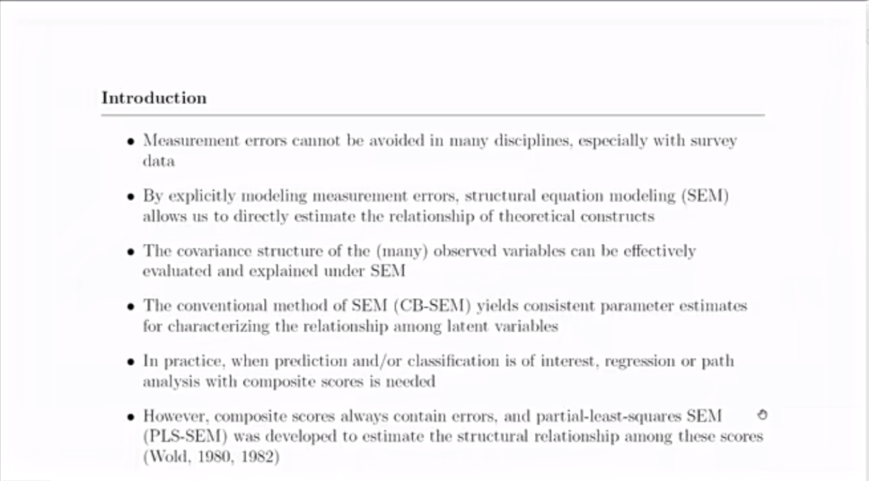首先,袁克海以评估数学成绩的方法为例,引出PLS-SEM模型的概念和应用特征。他指出,虽然数据测量误差无法避免,但可以对测量误差进行建模,通过结构方程模型(SEM)等方法评估初始理论与拟合模型之间的关系。接着,袁克海介绍PLS-SEM模型中结构方程(SEM)与路径分析结合的具体方法,即首先为每个个体生成加权得分,再使用加权得分进行路径分析。PLS-SEM易于计算的特点使得它在处理大数据和预测方面有很大的应用潜力,使用这种方法,研究者可以最大限度地提高变量间关系的统计检验力及预测精度。