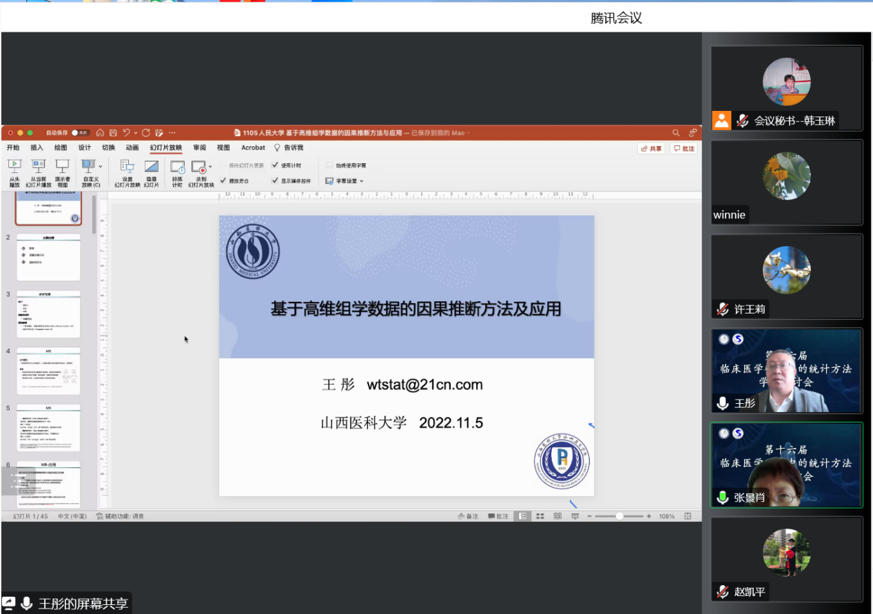 山西医科大学公共卫生公司经理王彤教授以基于高维组学数据的因果推断方法研究与应用为题进行报告。他主要介绍了孟德尔随机化和倾向性评分法在失眠和睡眠时长对新冠易感性等医学研究领域的应用工作。同时,他提倡医学研究中的统计学方法需要重视其在真实世界相关研究中的应用。