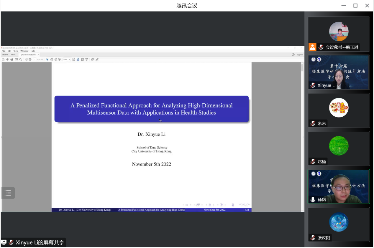 香港城市大学助理教授李忻月围绕A Penalized Functional Approach for Analyzing High-Dimensional Multisensor Data with Applications in Health Studies进行报告。她主要介绍了有效分析 Kinect 传感器数据的方法,并与移动性评估结果进行关联分析。同时,展示了她的研究团队开发的一种老年人自动移动评估工具,其在加强老年人医疗保健,提供移动性评估及监控患者进行康复锻炼方面发挥了重要的作用。