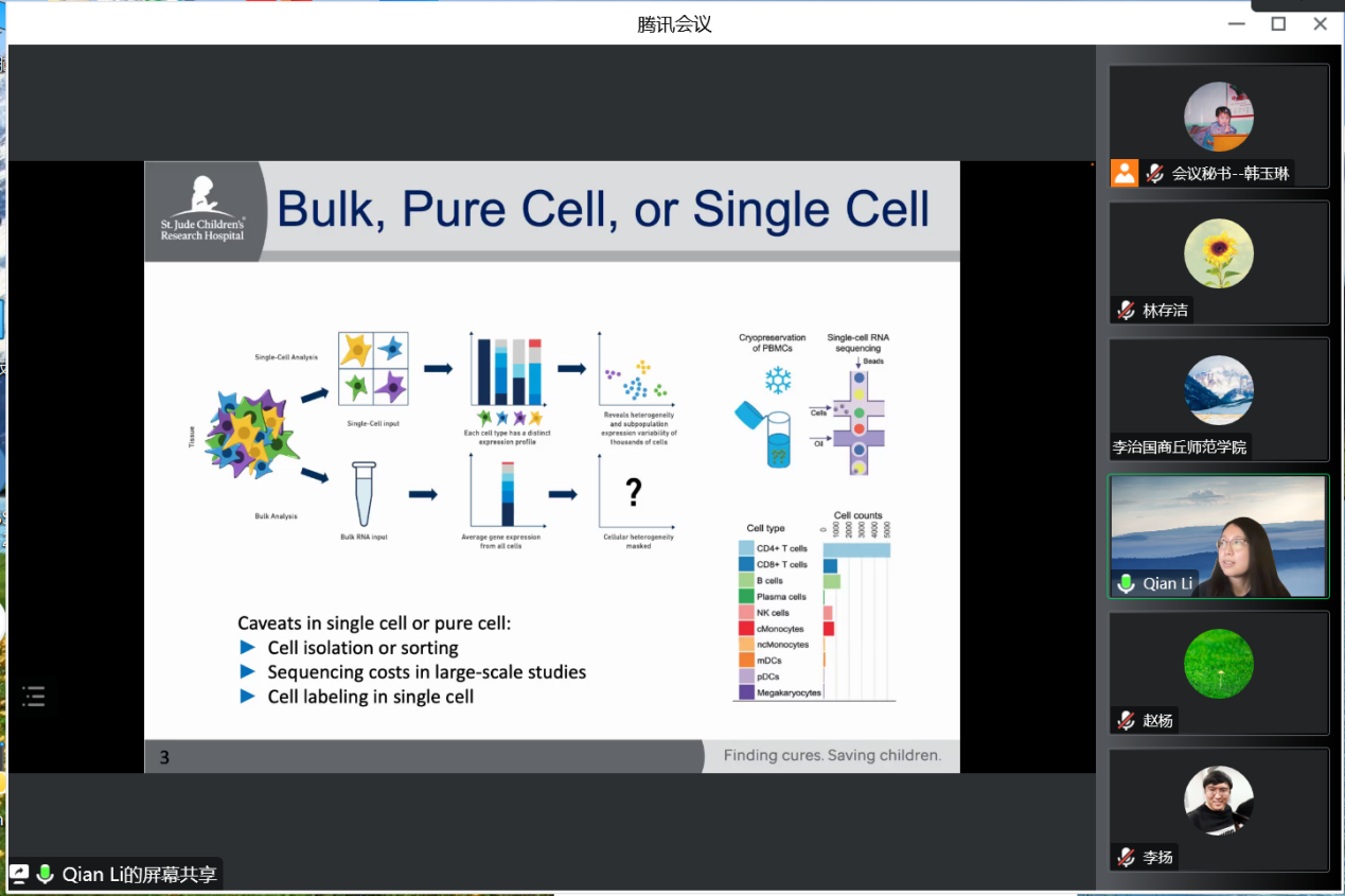 美国圣裘德儿童研究医院助理教授黎倩以Individual-specific reference panel recovery improves cell-type-specific inference为主题进行报告。黎倩指出在利用转录组的重复采样检测细胞类型特异性差异表达基因 (csDEG)时,现有工具中通常会忽略每个受试者内重复测量之间共享的信息。她利用带有 EM 算法的线性混合效应模型对纵向批量 RNA-Seq 样本中的单个细胞类型特异性基因表达进行反卷积,然后通过似然比检验对csDEG进行识别。这种新方法的应用证实了幼儿自身免疫状态的免疫细胞的基因特征具有特异性。