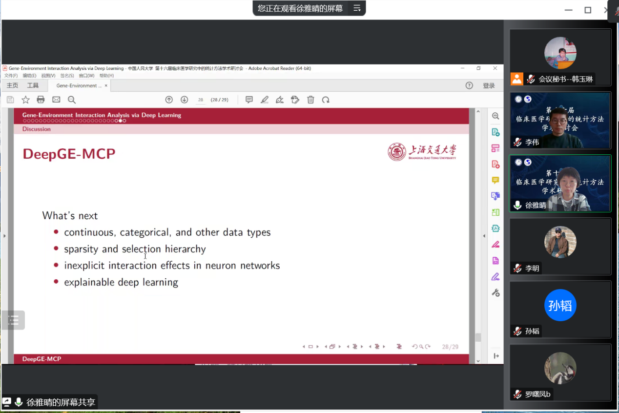 上海交通大学公共卫生公司助理研究员徐雅晴围绕利用深度学习的方式探索基因-环境交互作用这一主题进行报告。她的研究填补了基因-环境交互分析在深度学习发展领域的知识空白,并开发了一种基于深度神经网络并结合惩罚的分析方法。该研究通过提供一种强大的基于现代深度学习的新分析方法,有效地推进了基因-环境交互作用研究方法的发展。