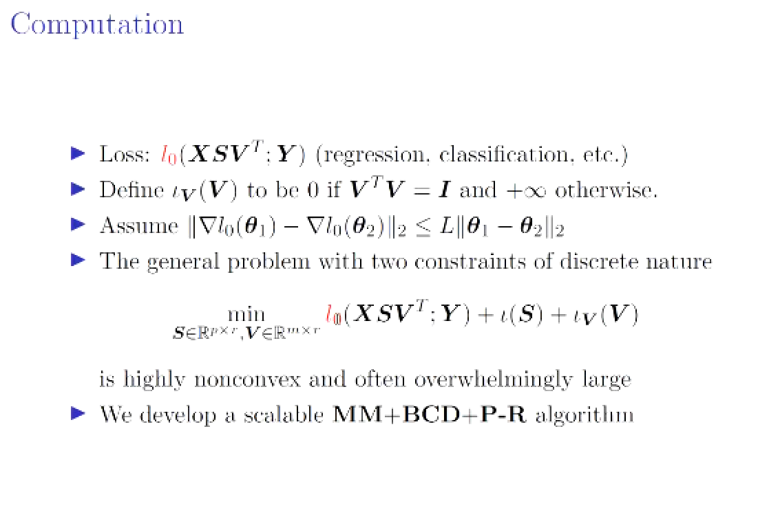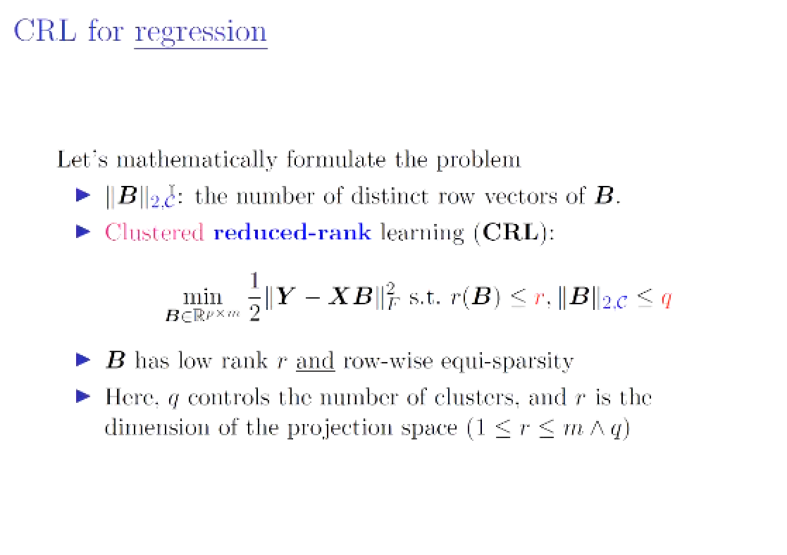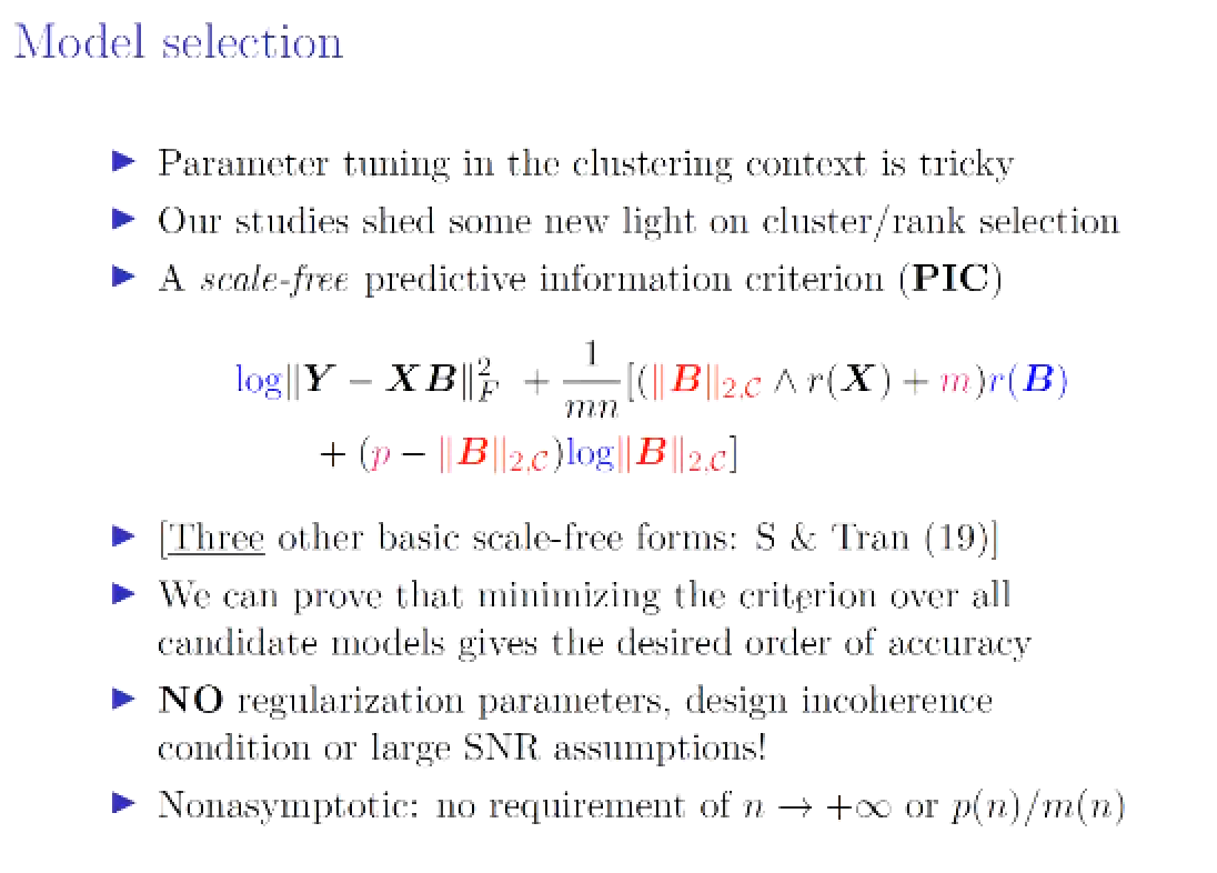 首先,Yiyuan She教授从有监督多变量学习中所面临的带有大量非零系数的“密集”问题出发,介绍了用于解决这类问题的聚类降秩学习(CRL)框架的背景与动机,从而引出了CRL框架的数理化定义。接着,Yiyuan She教授阐释了该框架中涉及到的SV形式与稀疏化成对差异的方法,并对单位秩、加权、无监督等特殊情形下的CRL框架变化进行了详细讨论。CRL框架在构建预测因子时施加了两个正则化联合矩阵,因而能够通过特征进行自动分组,它比低秩模型更容易解释,并且放宽了变量选择中严格的稀疏性假设。Yiyuan She教授还提到一种高效的优化算法,该算法能在保证收敛性的前提下对子空间进行学习和聚类。此外,Yiyuan She教授展示了其团队创造的一种无标度的预测性信息准则(PIC),并使用真实的实验数据对PIC的统计准确性和可解释性加以佐证。