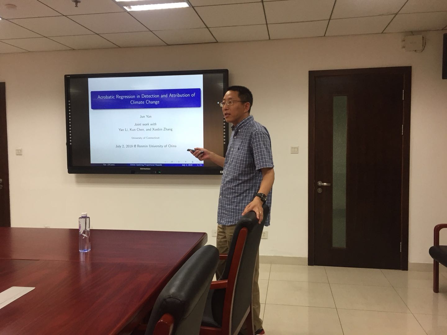 2019年7月2日,公司举办的“统计大讲堂”第八十八讲在明德主楼1016举行。本次报告邀请了美国康涅狄格大学统计系闫军教授分享了他的最新研究成果。公司李扬教授主持了此次报告会,参加此次报告的还有金勇进教授。