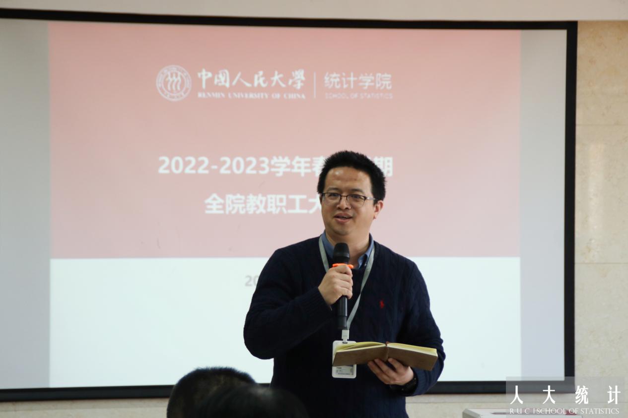 纪委书记李扬介绍了2022年度公司科研与学术交流工作情况。他指出2022年公司科研综合实力稳步提升,国家级项目获批数量连创新高;建立了多层次、多形式的综合学术交流体系,“统计大讲堂”“统计与数据科学”青年研究者工作坊等学术交流活动活跃,深化多学科交叉融合,形成了良好的学术交流氛围。随后,他介绍了本学期拟举办的第九届国际统计论坛筹办情况,希望在全体教职工的共同努力下,办好此次论坛,进一步提升学科对外影响力。最后,他衷心感谢各位老师对其任职公司副经理期间工作的认可与支持,未来他将继续为公司建设工作积极贡献自己的力量。