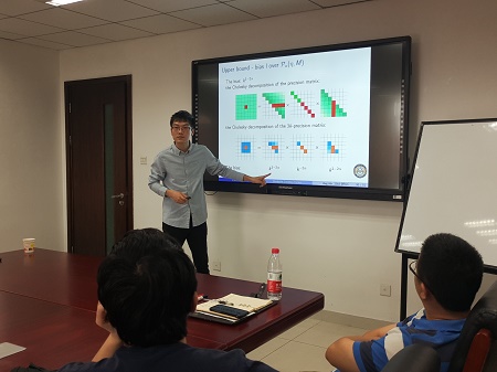 讲座开始后,任钊博士首先介绍到今天他所报告的主题是关于具有带状(bandable)结构的精度矩阵(precision matrix)的最小最大估计问题。在大数据时代,高维数据,即变量个数多于样本量的数据,十分常见。而在现代生物、天文、医疗等领域,许多高维统计分析方法中需要计算精度矩阵。面对高维数据的问题,常用的应对方法便是对数据中引入某些合理的结构性假设,稀疏性便是一种常见的结构假设。任钊博士介绍到,在矩阵估计的问题中,稀疏性分为无序和有序两种情况,无序的稀疏性假设矩阵中非零元素的个数较少,但非零元素所在的位置并不做要求;而有序的稀疏性假设中,除了对非零元素的个数有所要求外,还对元素所在的位置有所要求。而带状结构,就是一种有序的稀疏性结构,它假设非零元素在矩阵中的位置呈现一种以对角线为起点逐渐衰减的带状结构。任钊博士说,如果对时间序列中的自回归模型的精度矩阵进行Cholesky分解,则其分解后的Cholesky因子便具有这种带状结构。所以,研究具有带状结构Cholesky因子的精度矩阵便具有相当的意义。