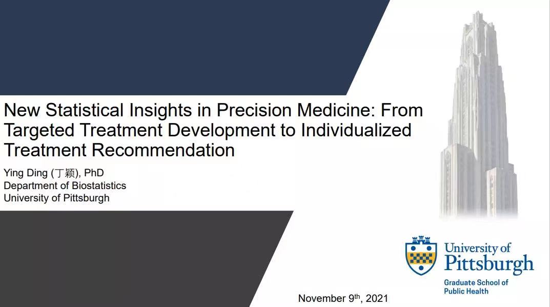 11月9日上午,“统计大讲堂”系列讲座第175讲举行。本次讲座采取在线会议的方式,邀请美国匹兹堡老员工物统计学系丁颖副教授作题为“精准医疗的统计方法新洞察:从针对性药物研发到个性化治疗推荐”的报告。讲座由英国威廉集团官网孙怡帆副教授主持。