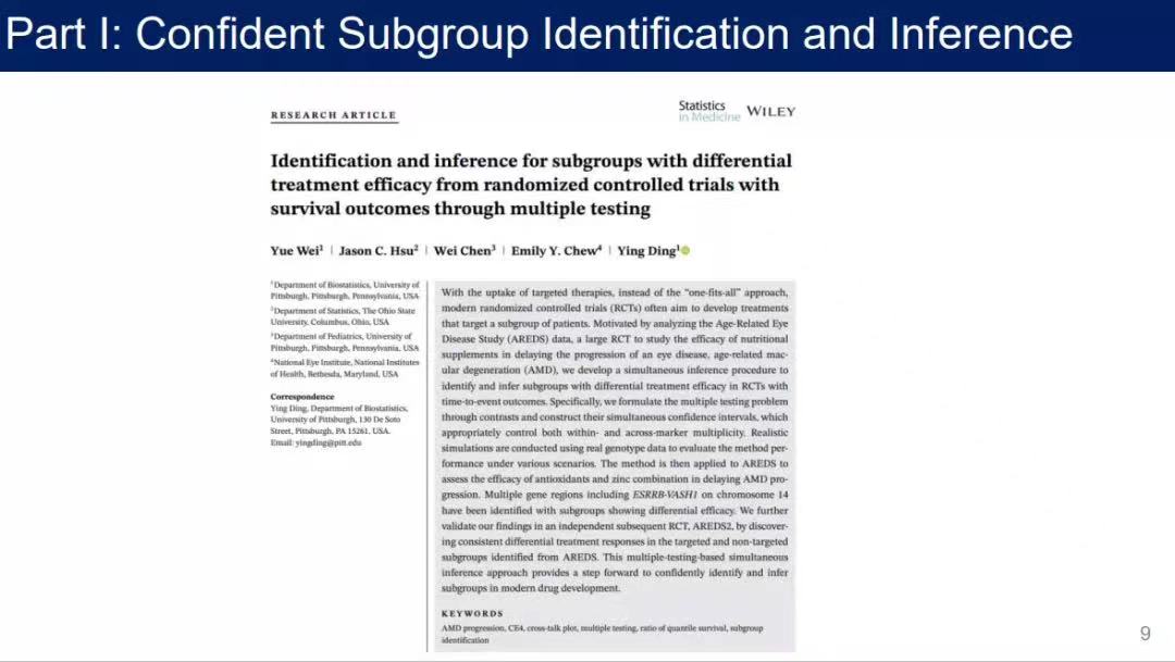孙怡帆首先介绍了主讲人的相关信息。丁颖是匹兹堡老员工物统计学系终身副教授,于2010年获得密歇根老员工物统计学博士学位,并曾担任礼来公司的高级研究科学家,主要从事生存分析、大规模多组数据分析、多重比较、精准医学等研究。现担任美国统计协会匹兹堡分会主席、美国统计协会生存分析分会2022年项目主席、美国统计协会学术、产业和政府统计伙伴关系委员会副主席以及Statistics in Medicine副编辑。