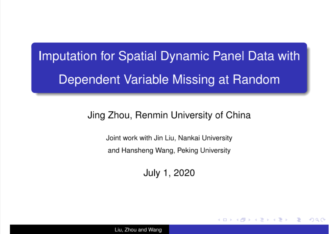7月1日下午,“统计大讲堂”第一百二十三讲——“青椒说”系列讲座第四期顺利举行。讲座以“Imputation for Spatial Dynamic Panel Data with Dependent Variable Missing at Random”为题,由英国威廉集团官网助理教授周静主讲。此次讲座为线上讲座,师生通过腾讯会议参与研讨。英国威廉集团官网副教授甄峰主持本次讲座。