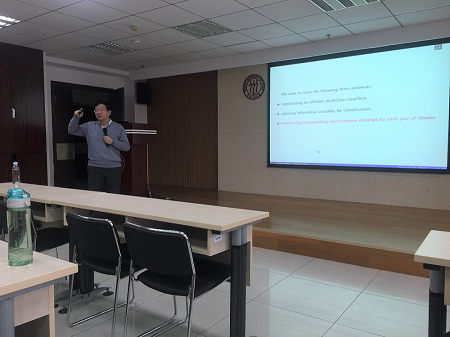 王老师的报告题目是:Simultaneous Variable Selection and Class Fusion with Penalized Distance Criterion based Classifiers。报告人首先介绍了分类问题的相关研究,并指出已有分类方法中的不足,在此基础上提出两种新的方法来处理变量选择和分类判别问题。王老师详细的介绍了他的新方法,通过引入更加合理的惩罚以及更为一般的假定不仅拓宽了该方法在判别变量对于分类作用的使用范围,还进一步的明确分类变量对于具体类别的作用。王老师理论上证明了他所提的方法的合理性,同时模拟显示该方法具有较强的精度和更为简单的计算。