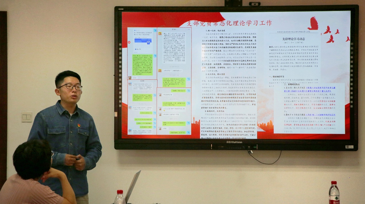 两名员工党支书进行了支部工作经验分享。本科生第四党支部书记高鹏禄介绍了党支部开展主题教育和常态化理论学习工作的经验。