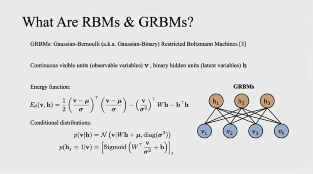 Renjie Liao首先简单介绍了受限玻尔兹曼机(以下简称RBMs)和高斯伯努利受限玻尔兹曼机(以下简称GRBMs)两种统计模型的基本概念,并将两者进行对比,说明GRBMs具备可观测连续变量的优势。由此,Renjie Liao表示,GRBMs不仅是一种用于深度学习的基础模型,还是可以同时处理离散型和连续型随机变量的混合概率模型,在其基础上可以开发更多算法。随后,Renjie Liao介绍GRBMs在物理与量子运算领域的广泛应用,指出该模型具备增强深度生成模型多样性的潜力,进一步表明GRBMs极高的研究价值。
