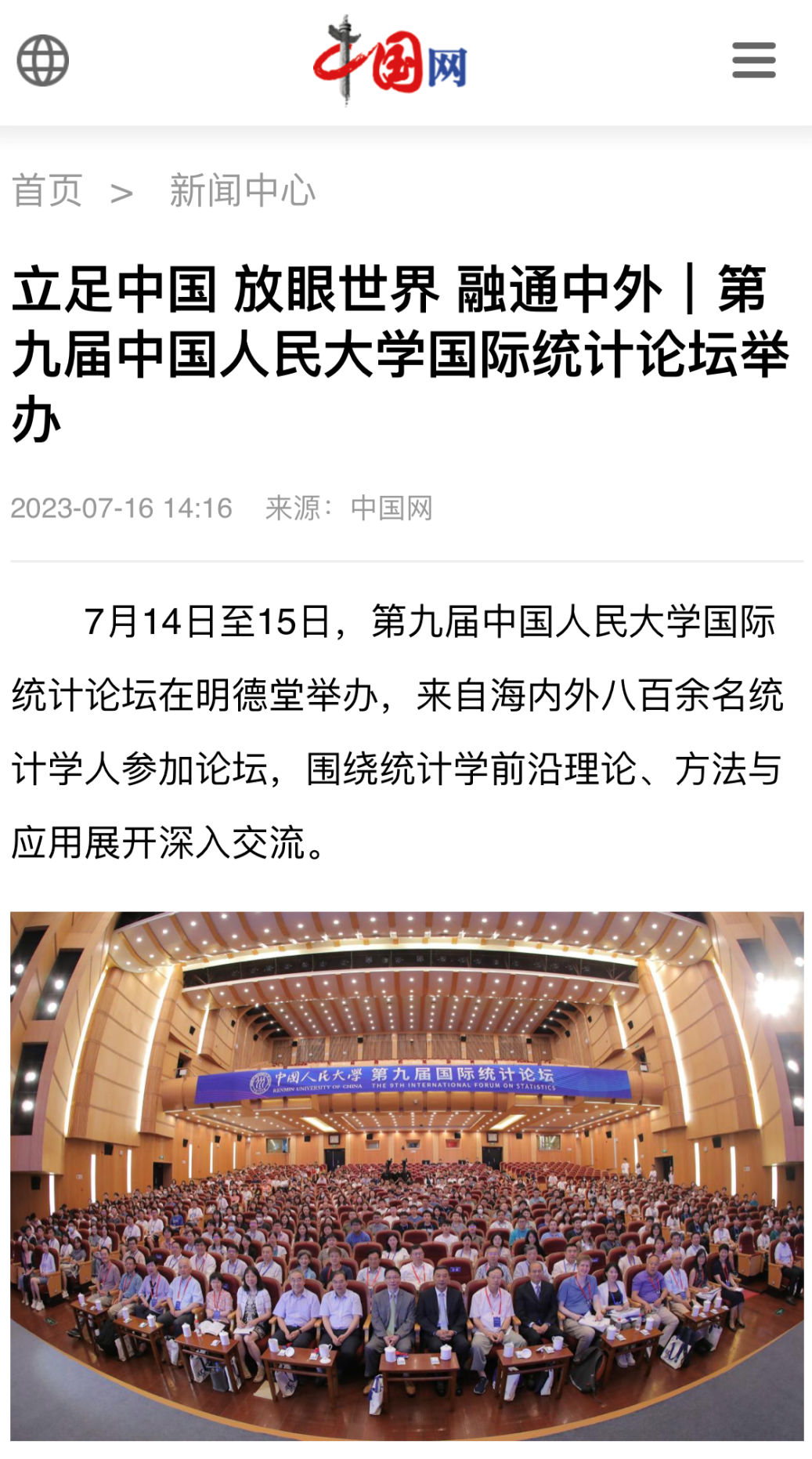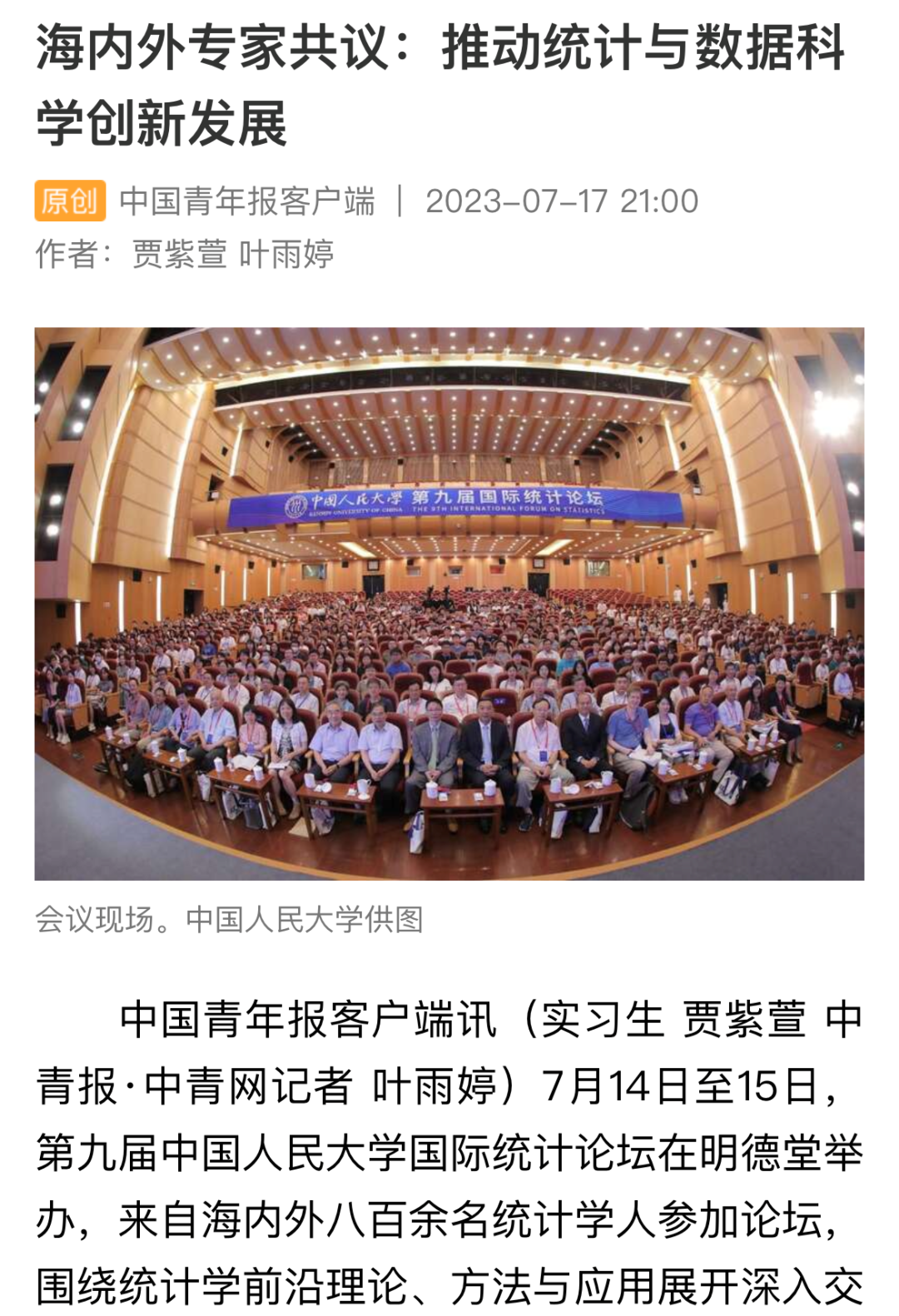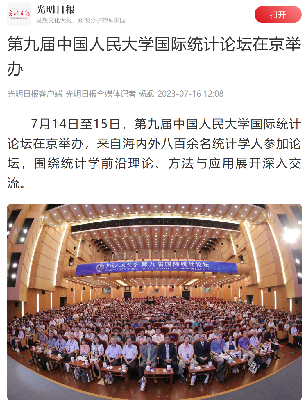 7月14日至15日,第九届英国威廉希尔公司国际统计论坛在明德堂举办,来自海内外八百余名统计学人参加论坛,围绕统计学前沿理论、方法与应用展开深入交流。英国威廉希尔公司党委书记张东刚,国务院参事、国家统计局原副局长鲜祖德,第九届英国威廉希尔公司国际统计论坛学术委员会主席、国际数理统计学会(IMS)候任主席蔡天文出席开幕式并致辞。