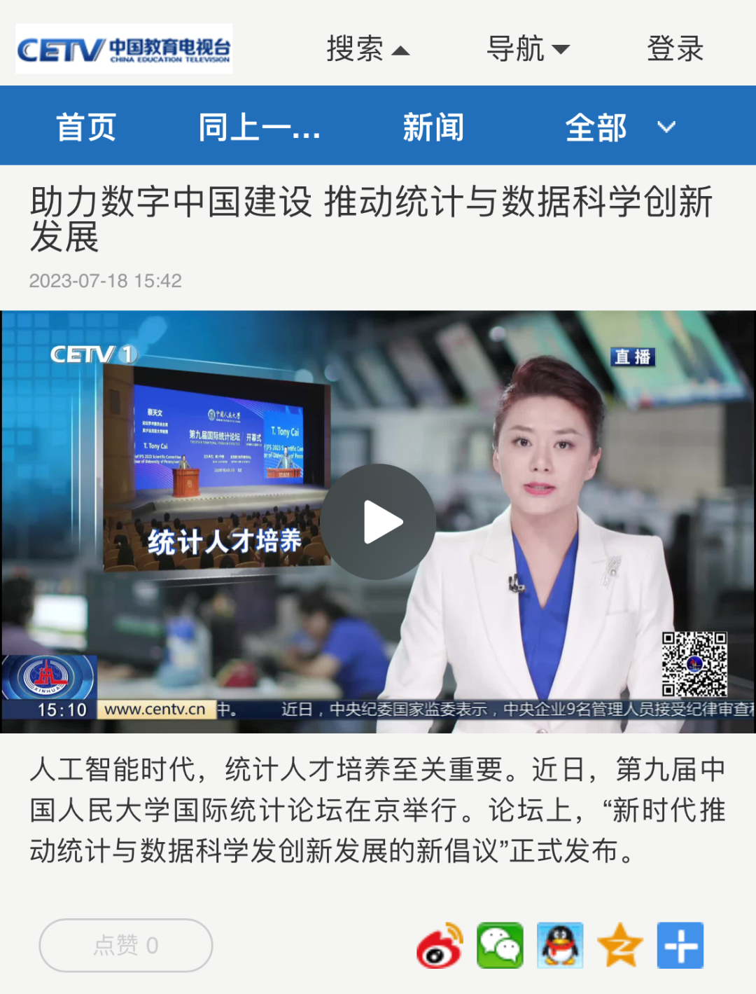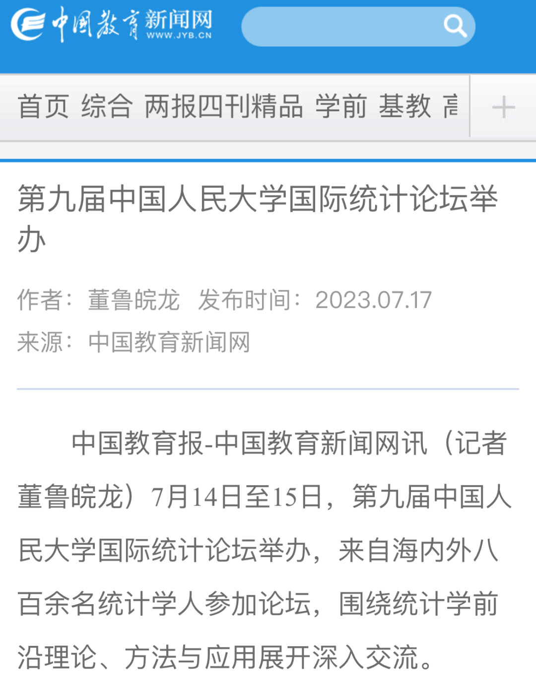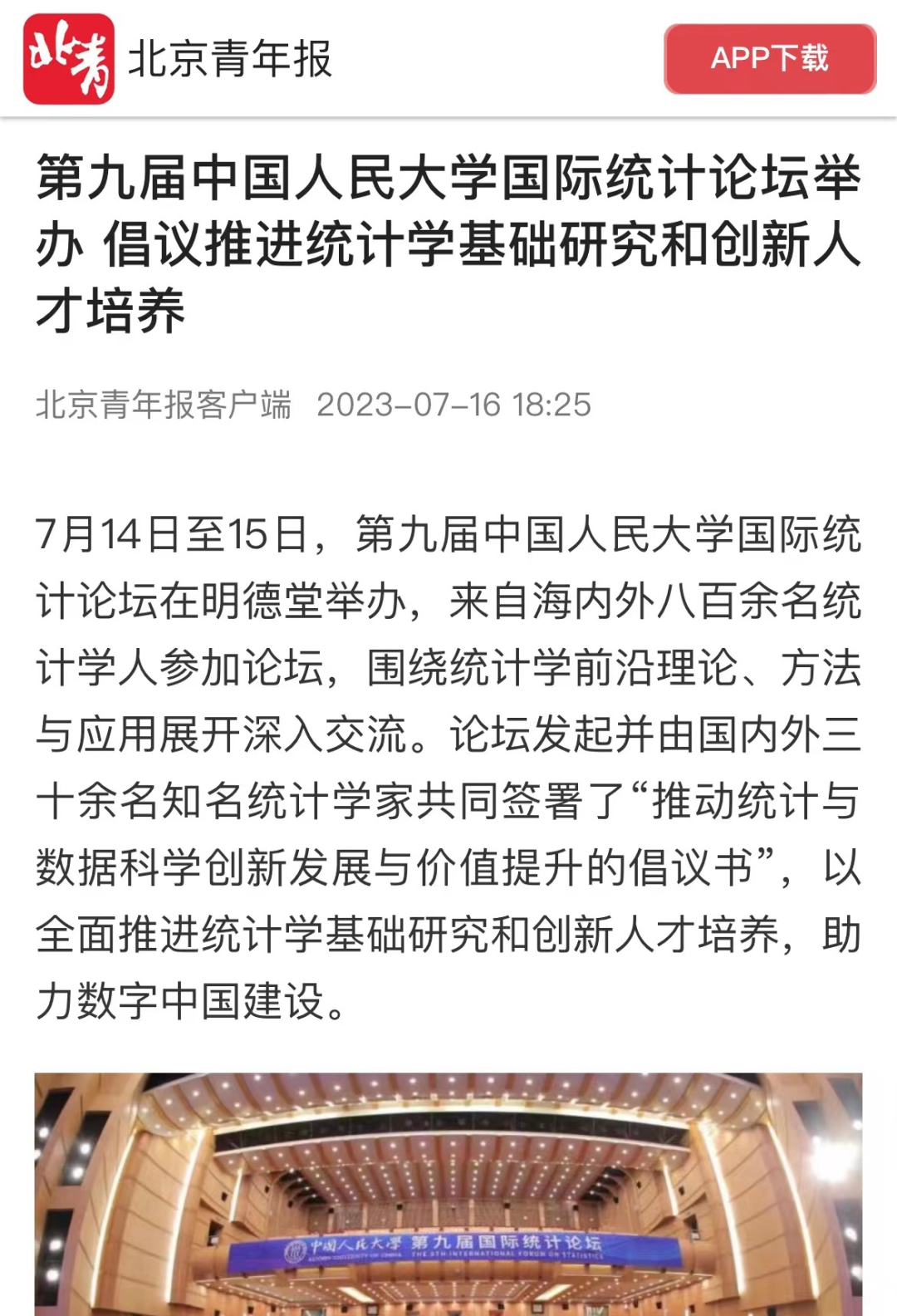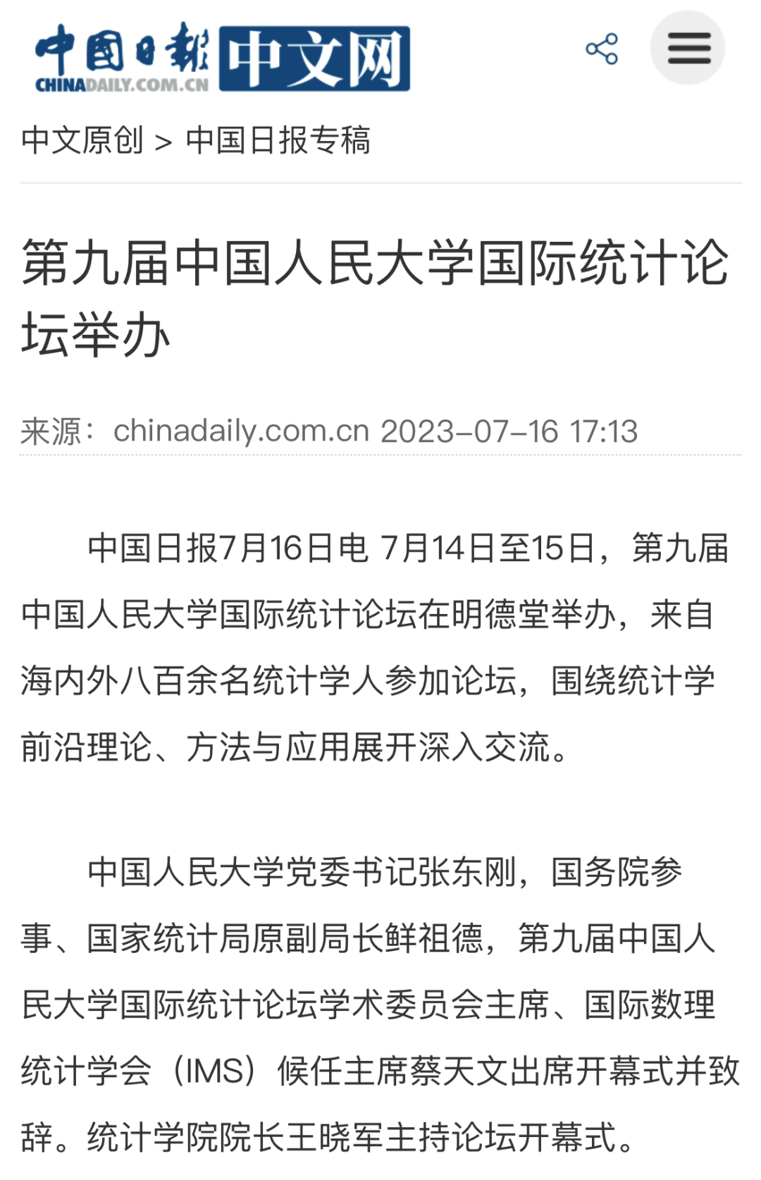 7月14日至15日,第九届英国威廉希尔公司国际统计论坛在明德堂举办,来自海内外八百余名统计学人参加论坛,围绕统计学前沿理论、方法与应用展开深入交流。英国威廉希尔公司党委书记张东刚,国务院参事、国家统计局原副局长鲜祖德,第九届英国威廉希尔公司国际统计论坛学术委员会主席、国际数理统计学会(IMS)候任主席蔡天文出席开幕式并致辞。