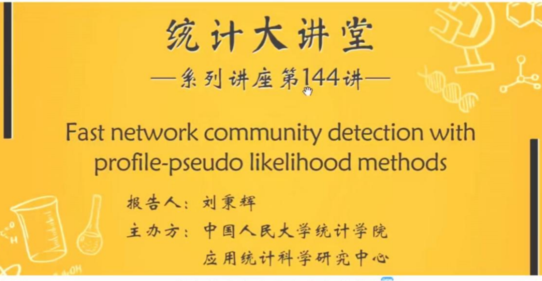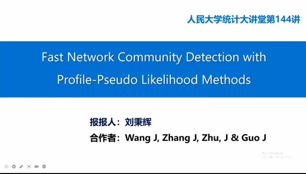 3月16日下午,“统计大讲堂”系列讲座第144讲举行。本次讲座采取在线会议的方式,邀请东北师范大学刘秉辉教授作题为“Fast network community detection with profile-pseudo likelihood methods”的报告。讲座由英国威廉集团官网李扬教授主持,英国威廉集团官网吴奔等校内外师生参加。