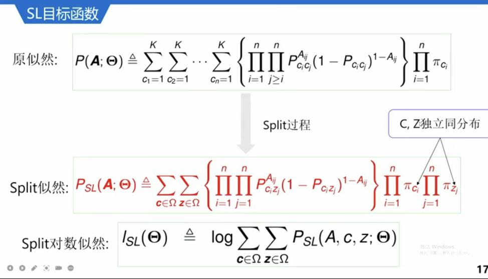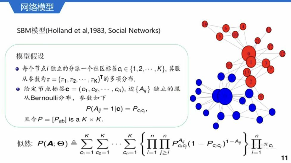 刘秉辉详细介绍了研究问题中图的表示、模型的建立和方法的选取。通过点集V和边集E,可以构成对称的或者不对称的网络N,该网络可以由一个|V|×|V|的邻接矩阵来表示。关于网络建模,他指出,当分析目的不同时,建立的模型和表述的结构就会不同。对于社区发现的问题,刘秉辉及其合作者主要研究随机块模型(SBM)。刘秉辉详细讲解了模型假设的过程,并对照形成似然的过程,简单介绍了通过EM算法来解决带潜变量的模型推断问题。