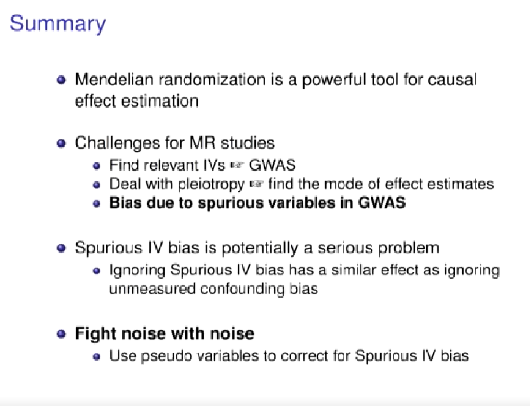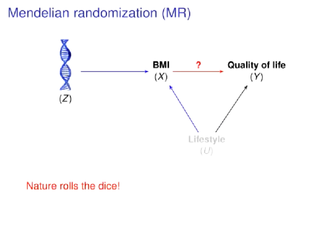 孔德含首先从生活中的超重这一普遍现象引入工作目标“超重是否会影响人的生活质量”,即用BMI衡量是否超重,研究BMI与生活质量之间的因果关系。但在这种情况下,会有一些混淆因素,如人的生活习惯,它会对BMI和生活质量造成不同影响。想要得到BMI与生活质量间的因果效应,就需要通过outcome等模型去校正这些混淆变量。而实际生活中,这些混淆因素往往不能都观测到,因此没有办法通过校正混淆因素的方式得到因果效应的估计。随即,孔德含介绍了Mendelian randomization(MR)方法来解决上述问题。若通过一个随机试验(如用人的基因型进行区分)得到的一串随机的BMI值,它们就不会被后天的混淆因素所影响。