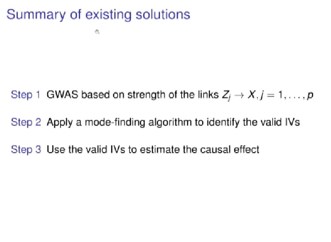 孔德含指出,自然实验并不完美。一是绝大多数基因型变量Z是无关的,如果想知道基因型与X相关,需使用GWAS分析。二是即使是相关的Z也可能无效。若一个基因的变种会影响多个特征,那么该基因可能是无效的。现存的方法分为三个步骤:第一步,通过GWAS找到与X相关的Zj;第二步,用mode- finding算法识别有效工具变量;最后一步,使用这些识别出来的有效工具变量进行因果效应估计。随后他举出一个模拟例子对上述三步加以运用,并分析了模拟中存在的问题及解决方法。