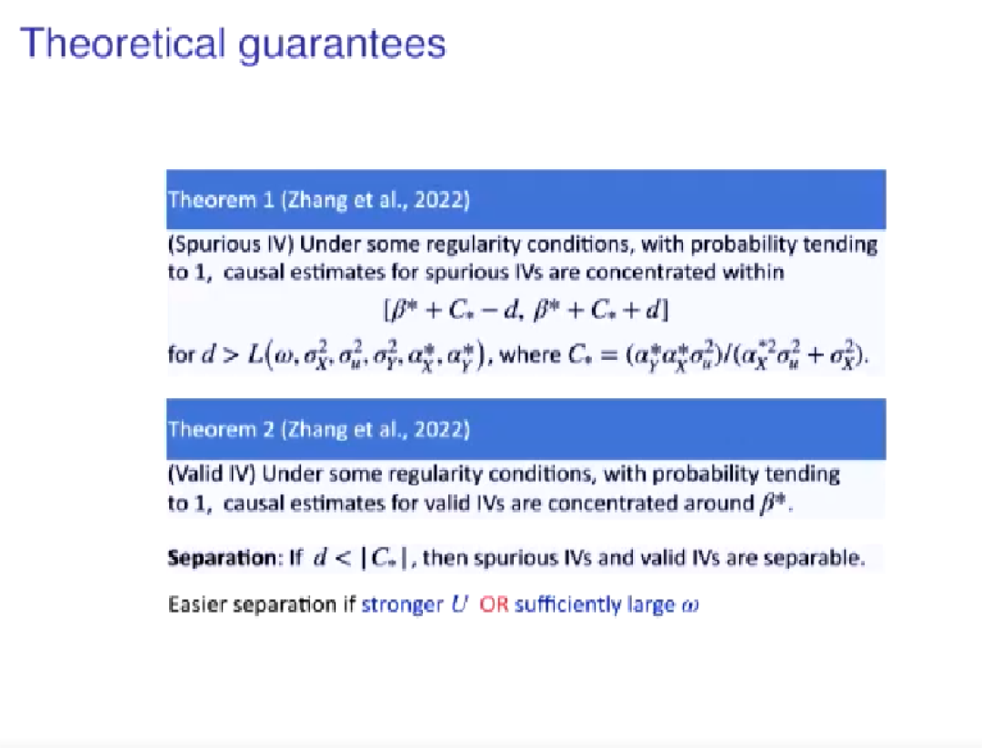 针对工具变量,孔德含介绍了用于分开无关和有效工具变量的两条理论。第一条,如果无关工具变量被选进来,那么它们的因果效应的估计就在一个含参区间内;第二条,对有效的工具变量,若概率趋于1,其因果效应的估计就集中于β*,即若d小于|C*|或U尽可能大或ω尽可能大,则伪变量与有效变量可以分开。