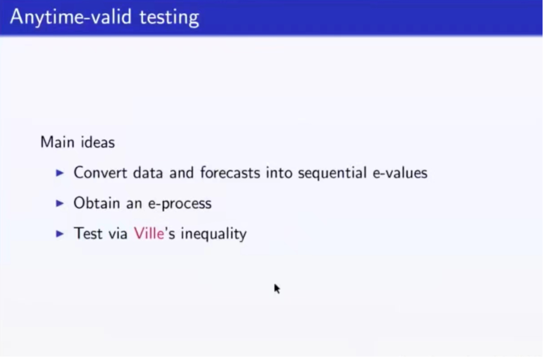 接下来,王若度提出e值和e过程的概念,介绍了通过e过程获得e值的方法以及e值在合并、控制错误发生率等方面的应用。他重点讲述了序列e值及其构造e过程的方法。在讲解了上述预备知识后,王若度给出检验ES的主要思想:第一步,把数据和预测转换为序列e值;第二步,通过序列e值获得一个e过程;第三步,通过Ville’s不等式去验证原假设。其中,最关键的步骤是第一步中如何构造e值。