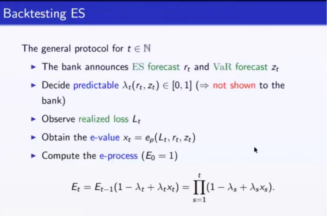 首先,王若度从风险管理中的VaR模型和ES模型讲起,引出了backtesting的概念并详细阐释其含义。随后,他介绍了对VaR进行回溯检验的具体步骤,并指出该步骤并不适用于ES,进而提出问题——如何构造简单方法来检验ES并使得该方法在不依赖于预测ES的模型的同时对任意时间有效。