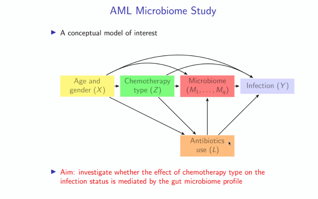 张月霞首先介绍了人体微生物组、风险因素和疾病之间的关系。在疾病治疗的过程中,治疗药物可能通过调节人体微生物组对疾病起到治疗作用,这种作用称为中介作用。估计中介作用需要去除混杂因素,比如抗生素也可能会对微生物组有影响,从而影响中介效应的估计。