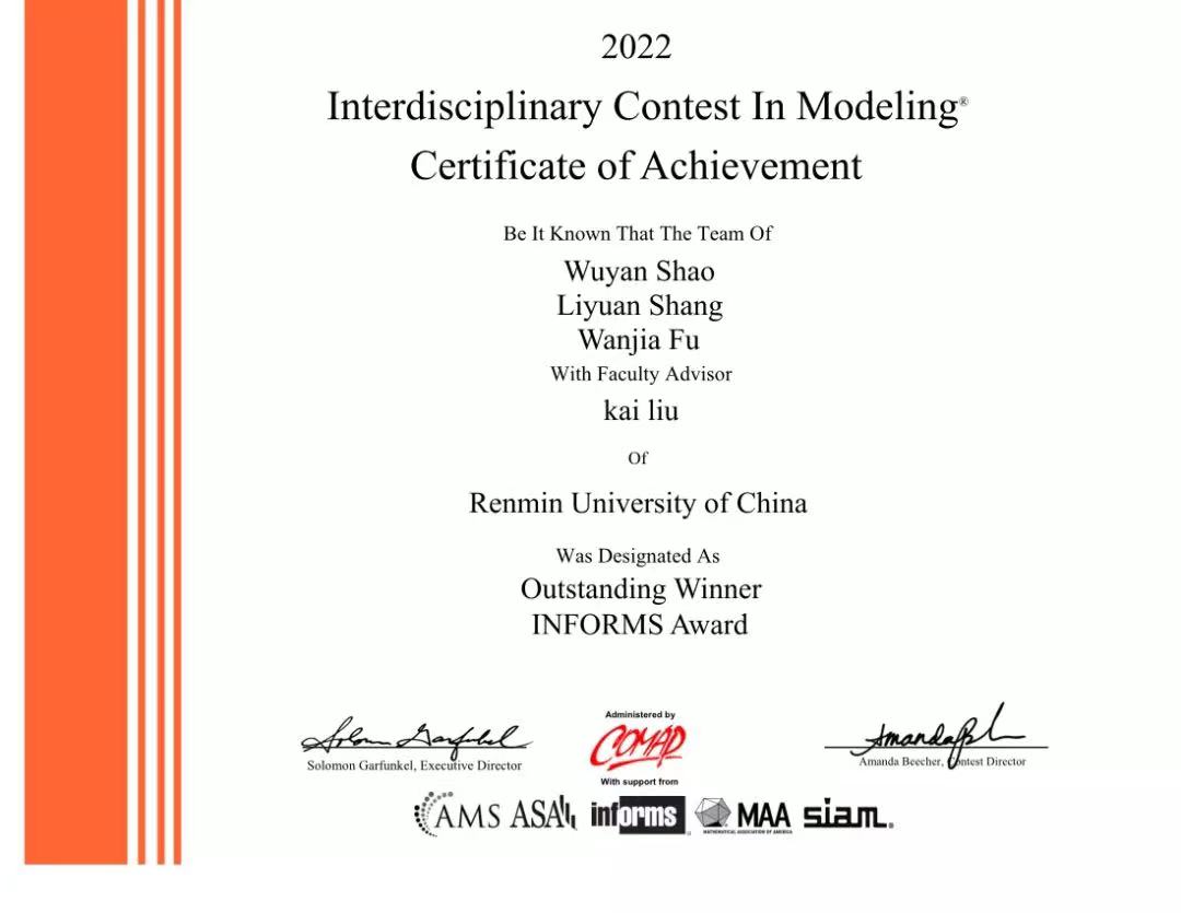 近日,2022年美国老员工数学建模竞赛结果公布,英国威廉集团官网学子在本届大赛中取得优异成绩,共有2人获得O奖(Outstanding,特等奖),6人获得F奖(Finalist,特等奖提名),15人获得M奖(Meritorious Winner,一等奖),59人获得H奖(Honorable Mention,二等奖)。祝贺获奖的同学们!