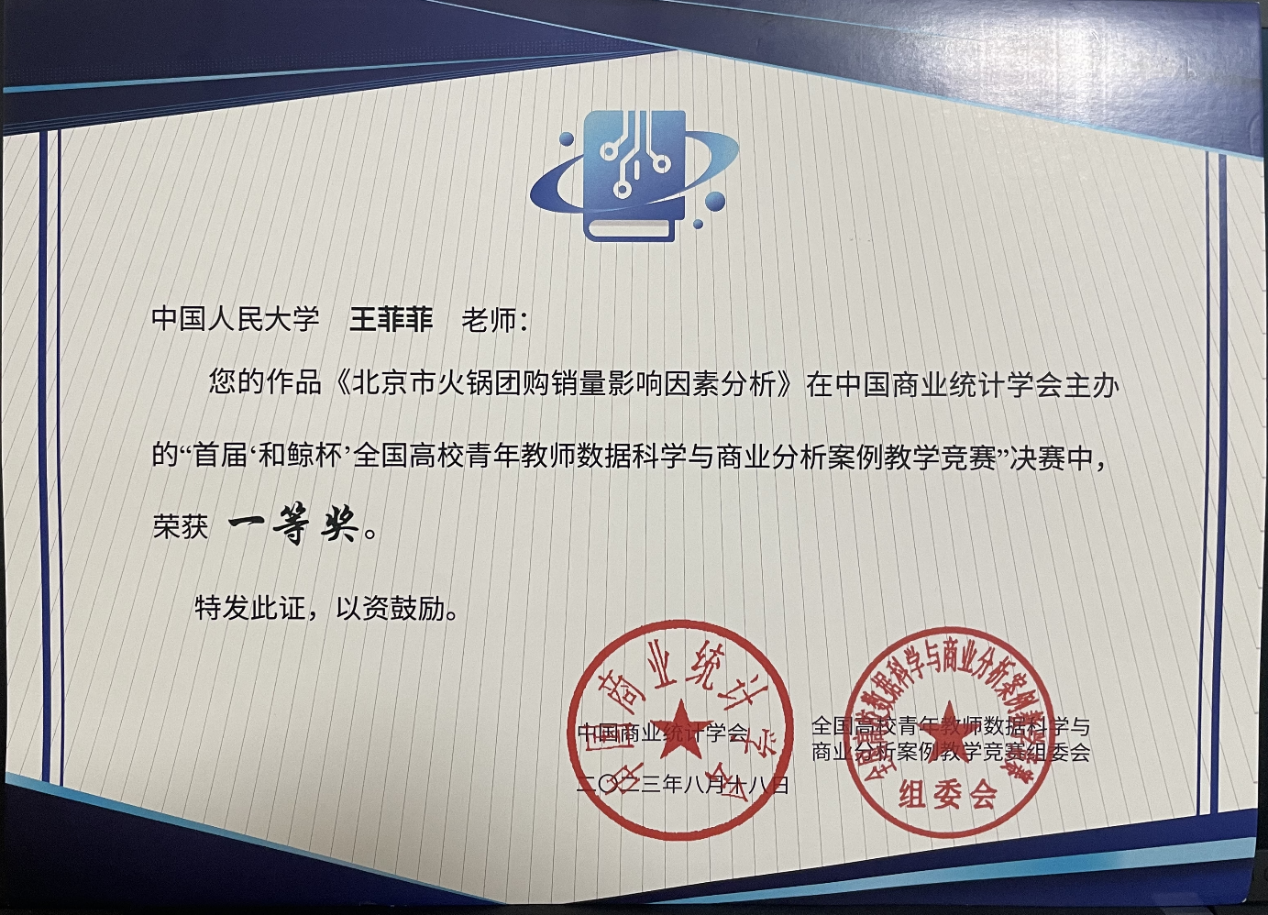 为了推动数据科学与商业分析领域教学模式的创新,以赛促教,激发教师们的教学热情和创新能力,以赛促创,激发员工们的创新潜能和能动性,中国商业统计学会于今年举办了首届“和鲸杯”全国高校青年教师数据科学与商业分析案例教学竞赛。本次大赛的决赛于8月17~18日在西安举行。经过激烈的角度,公司王菲菲教师凭借优秀的课程设计和先进的教学理念在大赛中获得一等奖。