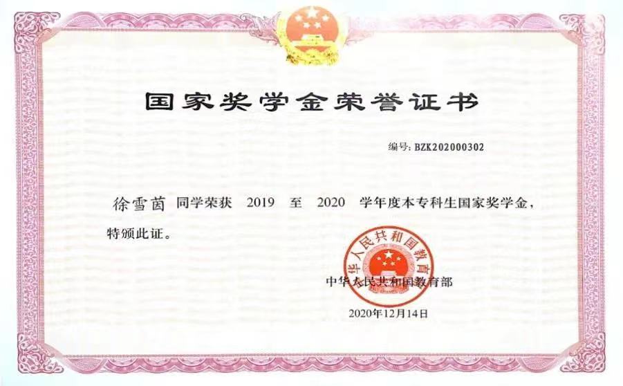 徐雪茵获国家奖学金