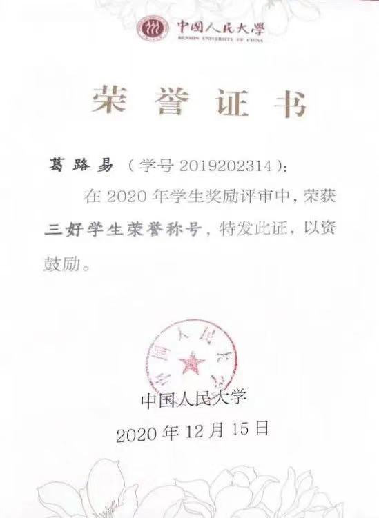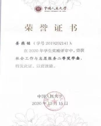 姜燕铭获社会工作与志愿服务二等奖学金