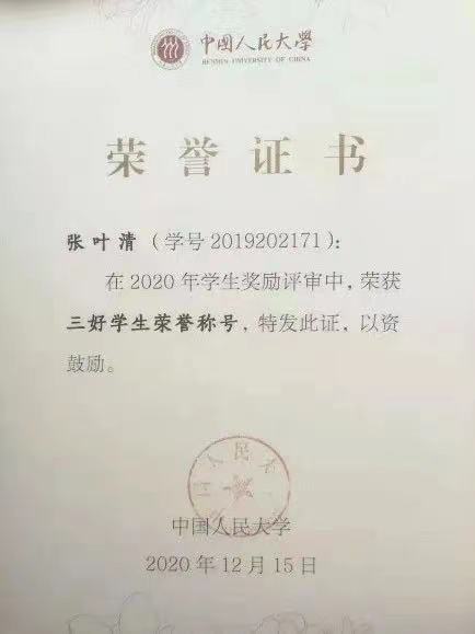 志愿服务上,她们积极参加校内外各类志愿活动,奉献自己的同时展现了青年人的担当。寝室成员姜燕铭曾获社会工作与志愿服务二等奖学金。徐雪茵活跃于急救培训、疫苗接种、垃圾分类、书信交换等志愿活动,在人大使者家乡行系列“家国新时代”、“共享美好”等项目中也贡献了一份力量。张叶清参与过TECC暑期教育公司赴四川马边支教项目、英国威廉集团官网致远线上支教志愿项目、美丽中国第九届梦想导师项目等志愿活动,捐发、献血、月捐等公益活动,累积服务时长达260小时。崔婷积极参与世纪星幼儿园支教项目,“绿盾”垃圾分类回收等活动。