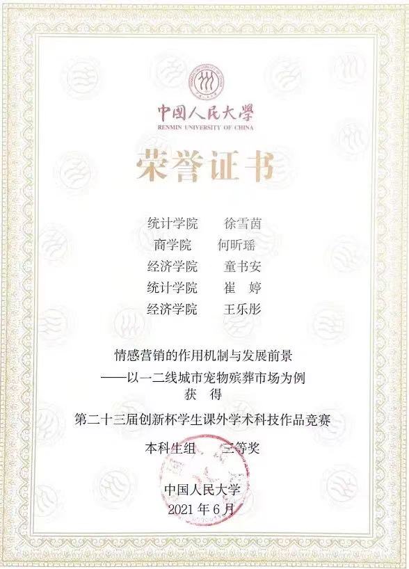 徐雪茵、崔婷获小创三等奖