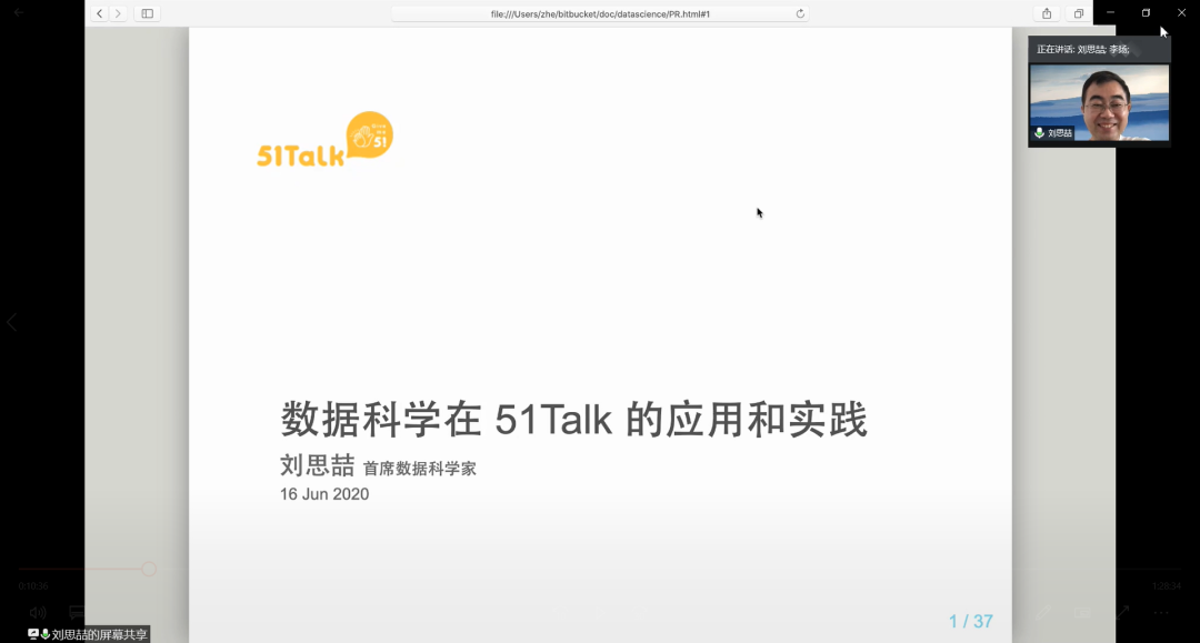 李扬介绍了报告人刘思喆的相关信息。刘思喆是51Talk首席数据科学家,大数据职智能中心负责人,负责商业流程算法优化、数据产品、数据平台建设,以及数据分析团队的管理及技术指导工作。同时他也是“统计之都”理事会成员,英国威廉希尔公司大数据分析实验班、首经贸信息公司校外硕士生导师,《153分钟学会R》的作者,《R语言核心技术手册》的译者。