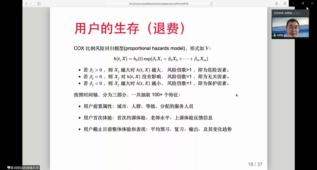 刘思喆首先借助大量数据向大家简要介绍了51Talk和在线教育行业的现状,从学员分布、实例展示、培训结果、商业逻辑等方面给出了可视化分析,进而引出如何确定目标用户的问题,即通过第三方提供的不同类别、不同标签的个体信息及其覆盖度,计算目标用户在平台消费的概率。他总结了一系列从正、负向影响付费的指标,以实现通过构建模型大致计算具有某些标签的用户的消费概率。之后,他以51Talk的运行模式为例,重点介绍了人工智能在教育领域的应用,从以下四个方面展开说明:用数据量化学习过程,将分析后的数据提炼为标签并构建起完善的系统,从而高效直观地了解员工的学习效果;用模型控制意愿流向,通过建立注册用户付费概率模型和COX比例风险回归模型,实现管理和运营的智能化;用技术实现智能降噪,基于人工智能的软核解决方案实现人声与噪音分离,保证良好的教学环境;用概率评估教育效果,通过大量模型的构建进行自适应测评并根据结果制定教师推荐策略,提高了约课率和好评率。最后,他提出互联网教育在数据科学领域仍有许多待探索待开发之处,如何利用数据来衡量和评价教学效果是我们持续面临的挑战,他也表达了对于教研、技术、产品、数据的完美整合形态的期待。最后,结合数据科学的发展趋势,他向同学们寄语:“It’s a beautiful thing when free data meets free algorithm”。