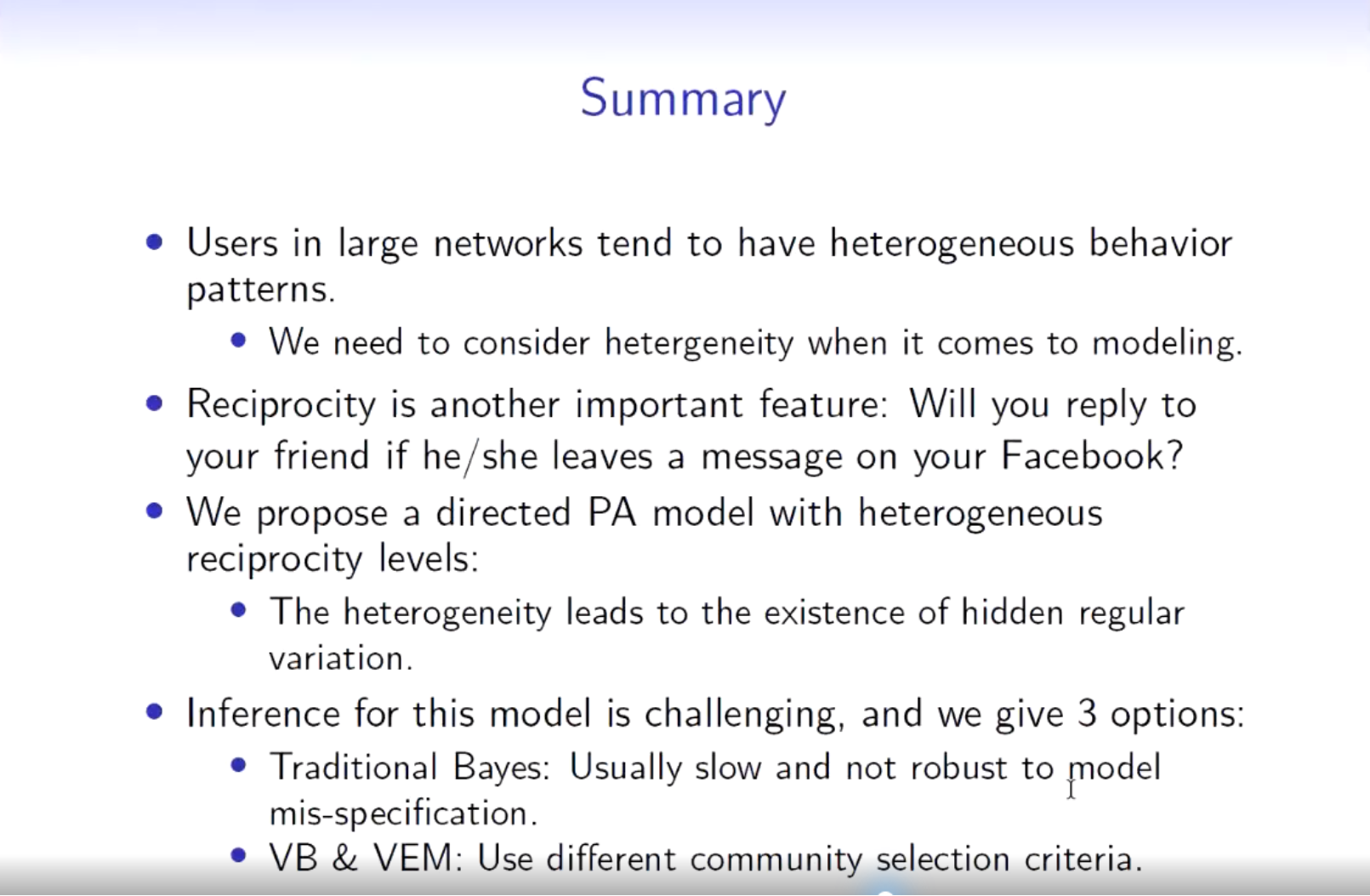 接下来,王天栋重点讲解模型的推导方法。她指出,传统的frequencies methods对于随机网络模型的推导有很大的局限性,因此王天栋考虑有限混合的贝叶斯混合方法(MFM)与VEM方法,并将其与传统贝叶斯方法进行比较,最终发现VEM方法能够较好地解释模型推导过程。
