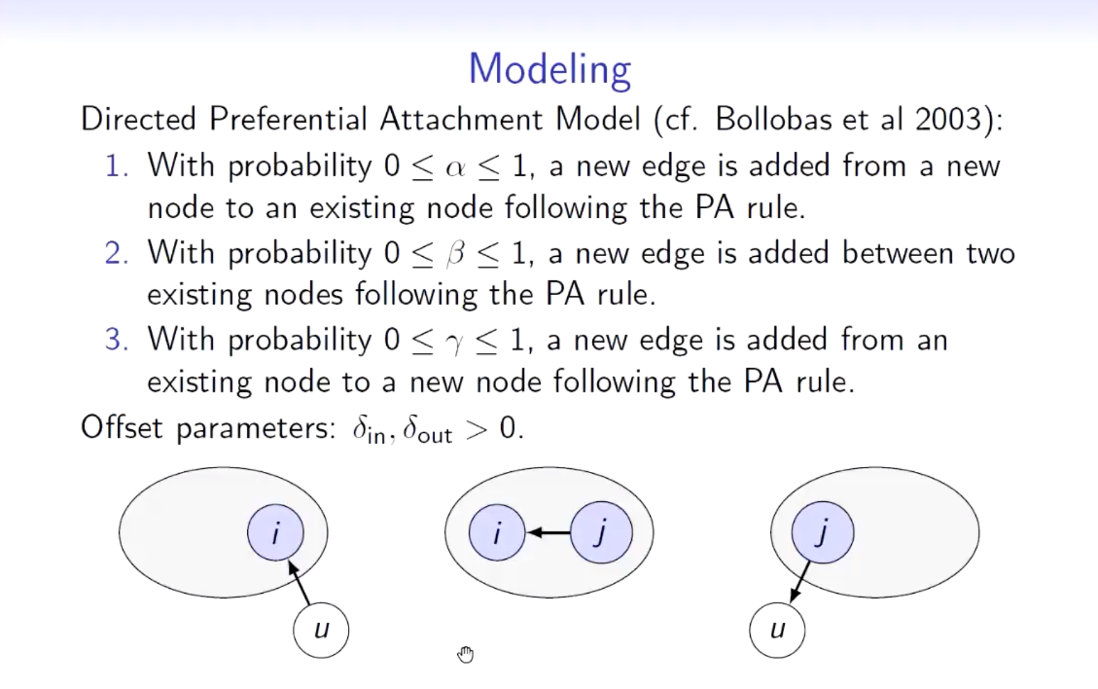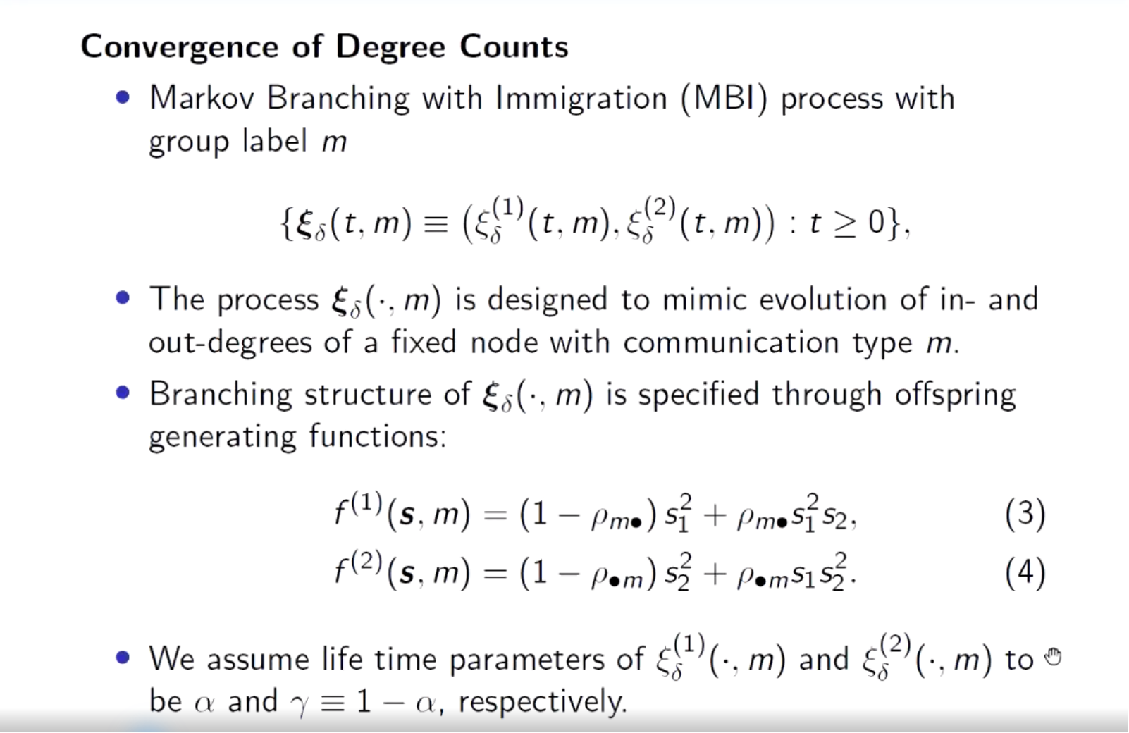 随后,王天栋介绍了Directed Preferential Attachment Model,并依次对于0≤ɑ≤1、0≤β≤1与0≤ϒ≤1三种情况展开详细讲解。王天栋还介绍了Convergence of Edge Counts和Convergence of Edge Counts两种关于Directed PA模型的理论性质,进而得出Directed PA模型具有渐进完全依赖性的结论。