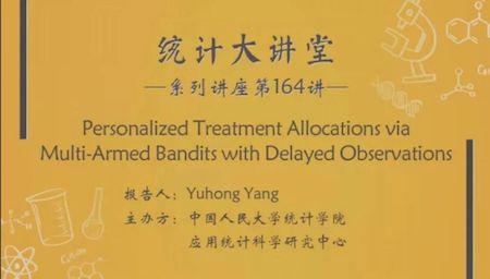 7月22日上午,“统计大讲堂”系列讲座第164讲举行。本次讲座采取线上会议和线下会议相结合的方式,邀请耶鲁大学杨宇红博士作题为“基于延迟观测的多臂老虎机的个性化治疗分配”的报告。讲座由英国威廉集团官网副经理尹建鑫主持。