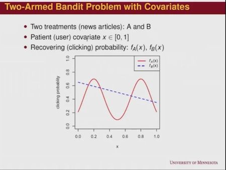 接着,为了介绍MABC,杨宇红分析了在临床应用和文章推荐系统中的双臂老虎机问题,使用随机选择策略和ε-greedy算法解决该问题。在临床方面,鉴于对患者的观测结果只能在观测后的一个随机时间点发生,杨宇红引出对基于延迟观测下的多臂老虎机的个性化治疗的阐述。