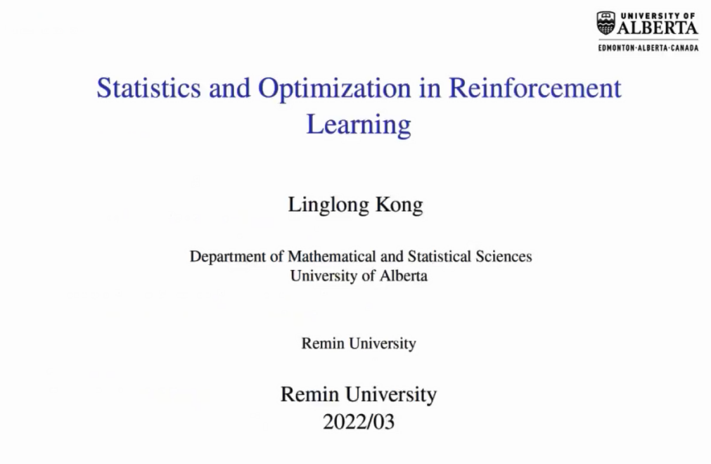 3月9日上午,“统计大讲堂”系列讲座第185讲举行。本次讲座采取在线会议的方式,邀请阿尔伯塔大学数学与统计科学系副教授Linglong Kong作题为“Statistics and Optimization in Reinforcement Learning”的报告,讲座由英国威廉集团官网教授许王莉主持。