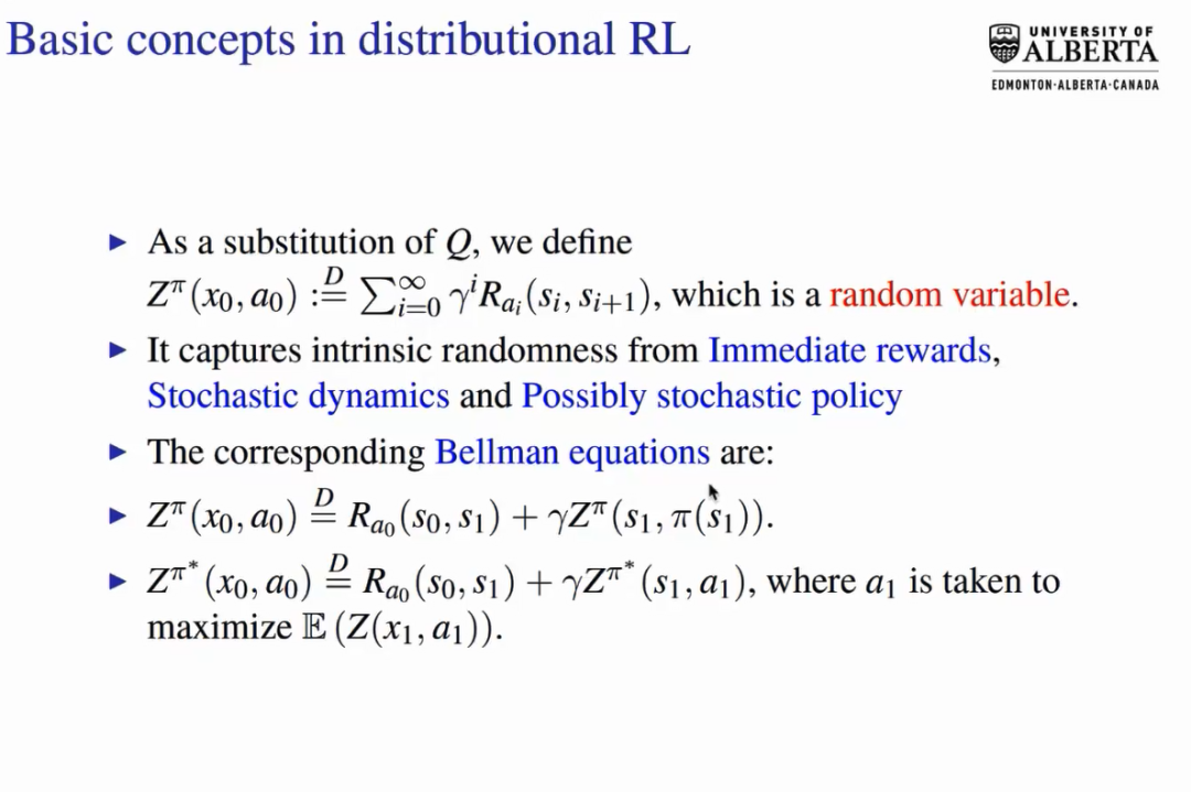 Linglong Kong首先介绍了强化学习的基础概念,接着介绍了强化学习的四个主要类别以及数个应用领域,包括游戏,机器人,推荐系统,自动驾驶等。他指出,除期望之外,目标函数的分布情况同样具有重要研究价值。因此,他提出了DRL模型用于研究目标函数分布,该模型重新定义了奖励函数,可用于模拟系统随机性以及策略随机性。贝尔曼方程也随之发生如下改变。