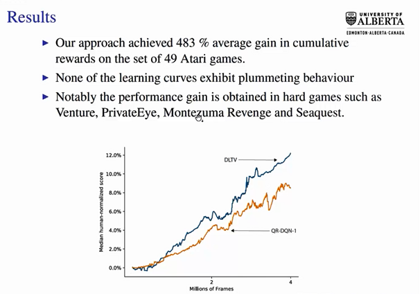 以该模型求解获得的分布可以运用于强化学习“探索-运用”困境中,此处Linglong Kong创立了DLTV探索方法,通过构建衰减左截断方差的方式寻求最优解。该方法在绝大多数情况下包括在自动驾驶领域数据下都取得了相较于传统方法更快、更优的结果。