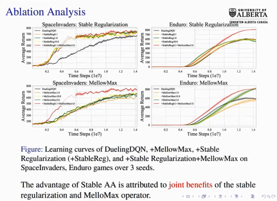 加速机制方面,Linglong Kong建立了安德森加速算法与准牛顿策略迭代法之间的关系。从而对于安德森加速算法有了更深入的认识;收敛性方面,Linglong Kong证明了安德森混合通过增加一个额外的收缩因子的方式增加了策略迭代方案的收敛半径;稳定性方面,Linglong Kong则提出了稳定的正则化,并将理论原则的MellowMax算子引入到安德森混合中,从而获得了稳定的安德森加速算法,并取得了较好的实验效果。