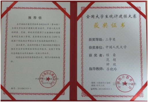 2015年12月,公司员工团队获得了“2015年全国老员工统计建模大赛”,三等奖及中国市场信息调查业协会的推荐信。该团队由公司2014级博士生程豪、范超和2014级硕士生钟琰组成,指导老师为吕晓玲副教授。这是公司唯一一支参赛的代表队。