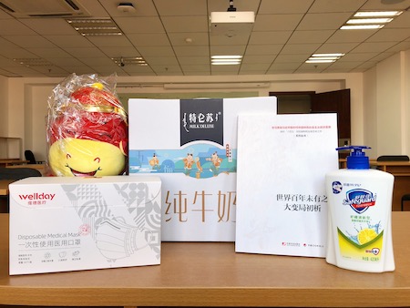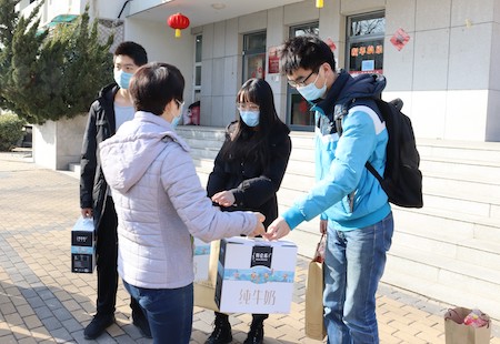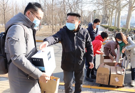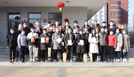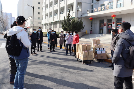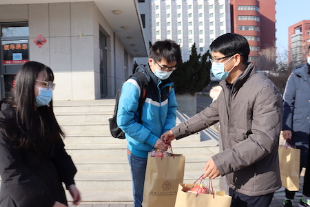 王晓军、孟生旺、王志丹、徐建萍、张育铭、李南、杨雯琦等老师一起为留校员工发放了包含牛奶、口罩、洗手液、图书《世界百年未有之大变局初析》、牛年玩偶等礼物的春节暖心大礼包,将新春祝福一一送到同学们手中。
