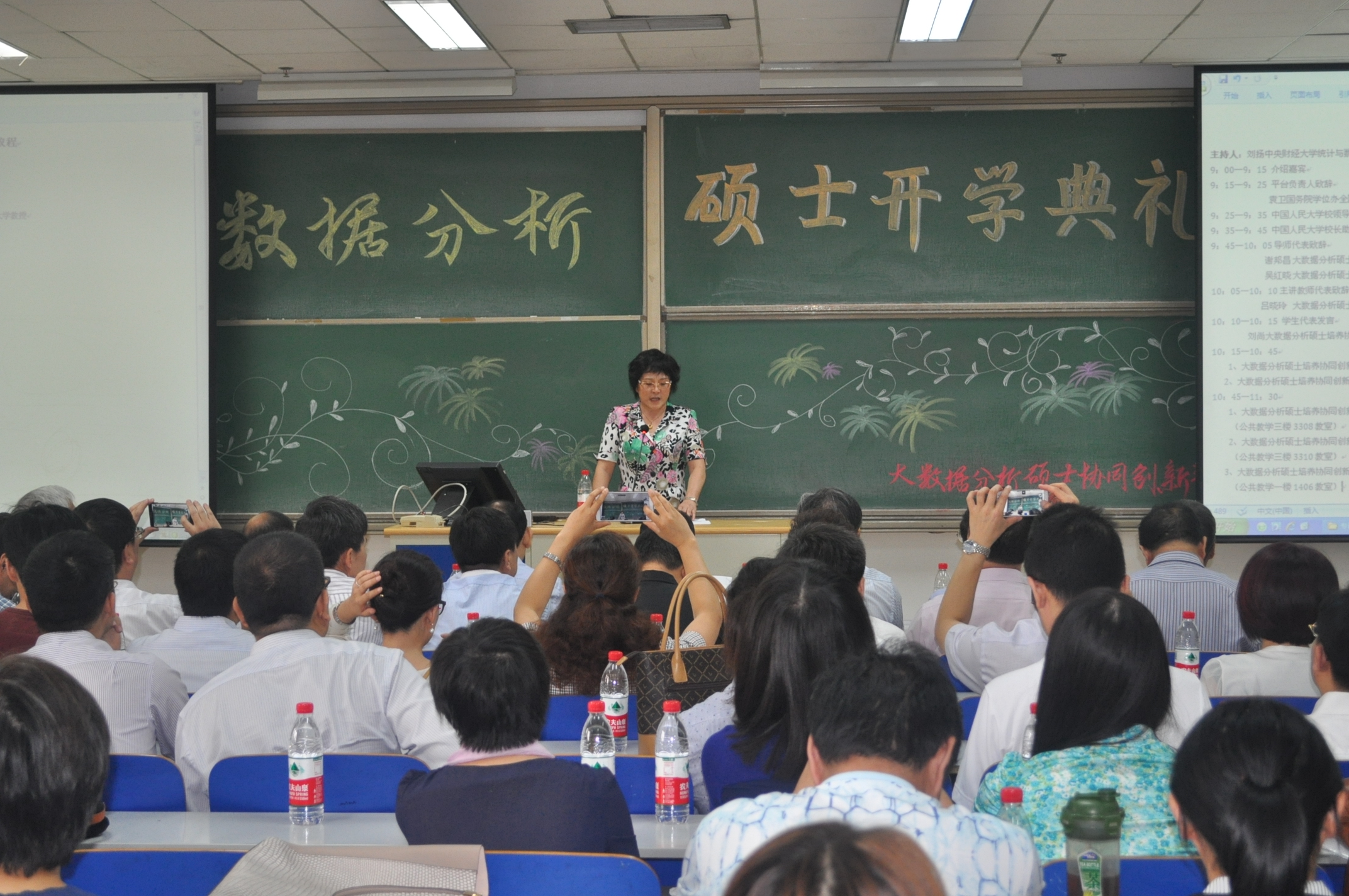 大数据分析硕士培养协同创新平台是一个向政府部门和企业等大数据分析人才需求单位开放的平台,目标是建成一个政产学研有机融和的协同创新平台,2014年5月19日平台成立大会就汇集了人民日报、新华社、中央电视台、中国移动、中国联通、中国电信、全国手机媒体专业委员会、SAS(北京)有限公司、华闻传媒产业创新研究院、北京华通人商用信息有限公司、龙信数据(北京)有限公司、赛仕软件(北京)有限公司,成为该平台的第一批实践培养和研发基地。这次开学典礼上又有中国科公司计算机网络信息中心、中国中医科公司、商务部国际贸易学会、国家食品安全风险评估中心、北京商智通信息技术有限公司、史丹索特(北京)信息技术有限公司、北京太阳金税软件技术有限公司、北京京东叁佰陆拾度电子商务有限公司、北京知行慧科教育科技有限公司、中关村大数据产业联盟、艾瑞咨询集团、北京百度网讯科技有限公司、阿里巴巴集团13家单位加入平台建设的联盟协作单位。实际部门的踊跃参与说明大数据分析人才培养的巨大发展空间。为了加强大学教授与实际部门专家的双导师培养,开学典礼上为第一届实验班专门聘任了26名实际部门专家为大数据分析硕士研究生指导导师。开学典礼之后,还举行了实践指导导师工作座谈会,中国科公司计算机网络信息中心主任助理、博士生导师黎建辉研究员介绍了中科院科学大数据,国家食品安全风险评估中心信息技术部主任助理肖革新博士介绍了食品安全与疾病控制大数据,京东(JD.com)推荐搜索部刘思喆经理介绍了京东商城的大数据工作,中国中医科公司学术管理处处长,中医药数据中心副主任谢琪研究员介绍了中医数据库及大数据所面临的问题,商务部国际贸易学会服务外包工作委员会秘书长高利峰先生等多位领导发言,纷纷为大数据分析硕士培养献计献策,座谈会形成了关于实践培养和案例研发等方面的共识。