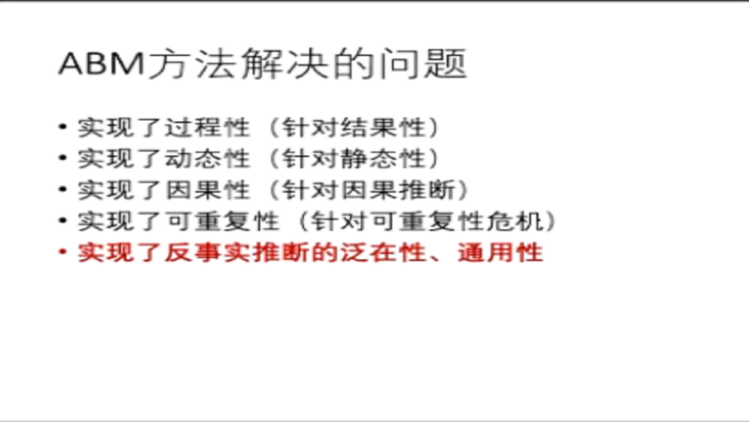 紧接着,吕鹏详细介绍了ABM方法。ABM相较于以往的研究方法,更能反应数据的动态性、过程性,实现了验证因果性、正确性的可能,实现了反事实推断的泛在性、通用性。同时,他也指出了ABM存在的问题,例如自主算法较少,不适应真实案例等,对应的解决的方案和思路是采用社会学习算法,获取社会矩阵,通过个人学习促进社会改进,实现全局最优。