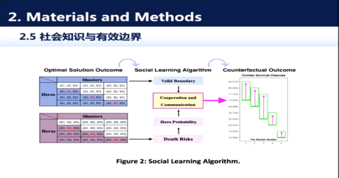 吕鹏进而讲解了目前正在进行的“如何将ABM仿真模拟运用于社会公共安全动力学”的研究,该研究应用了清真寺枪杀平民的案例,探索了社会学习算法的可行性,量化计算出最优解。他利用大量图表清楚明白地解释了社会学习可以增加社会群体智能的重要性这一结论。此外,他还介绍了“如何将人类群体行为模型与国家发展兴衰动力学模型融合”的研究。